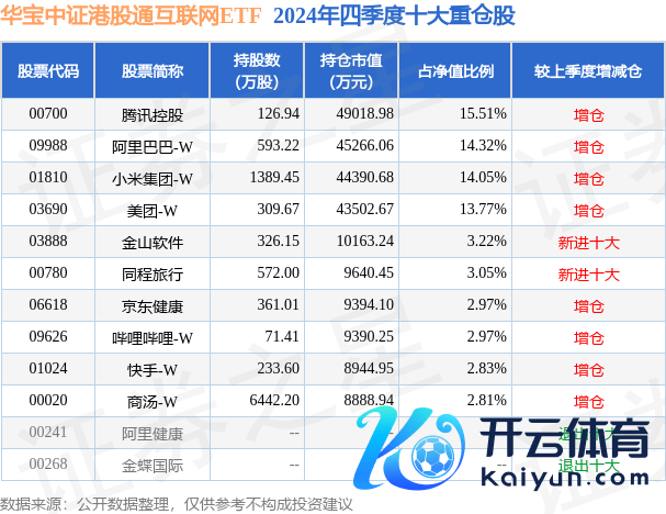 华宝中证港股通互联网ETF为指数型-股票基金,凭据最新一期基金季报知道,该基金财富建树:股票占净值比98.99%,无债券类财富,现款占净值比1.08%。基金十大重仓股如下: